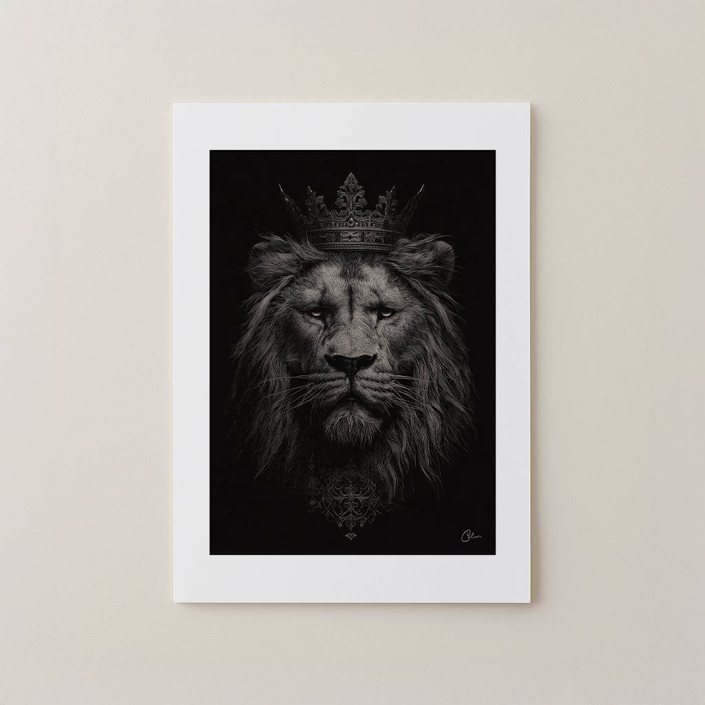 Sovereign Roar porträtterar ett kraftfullt lejon krönt med utsmyckad kunglighet, illustrerat i rika monokroma detaljer. Den mörka bakgrunden och fint texturerade linjerna skapar en intensiv, auktoritativ närvaro. Perfekt för vardagsrum, hemmakontor eller hallinredning, särskilt i utrymmen inredda med mörka träslag, metalliska accenter eller djärv maskulin inredning.