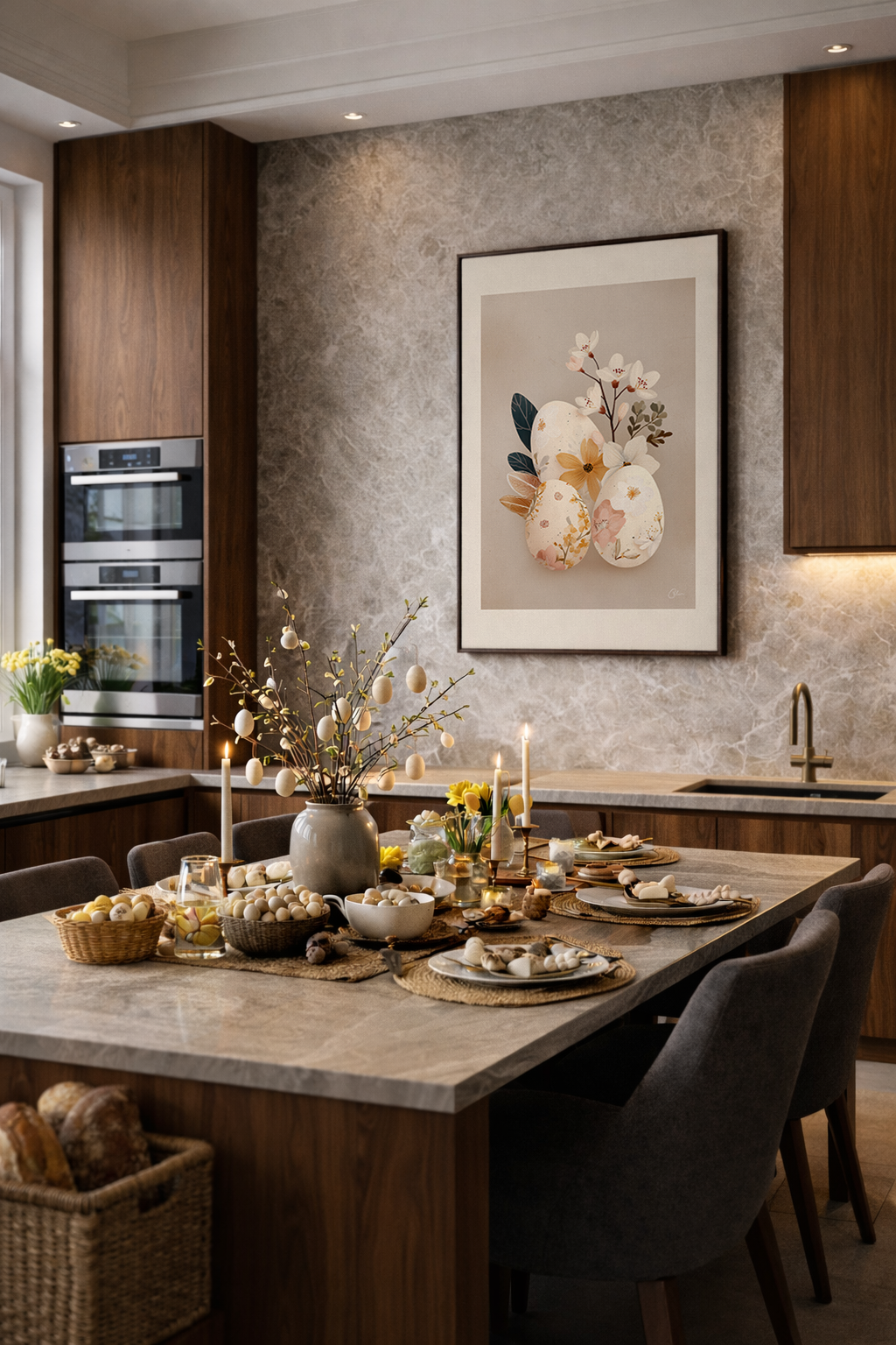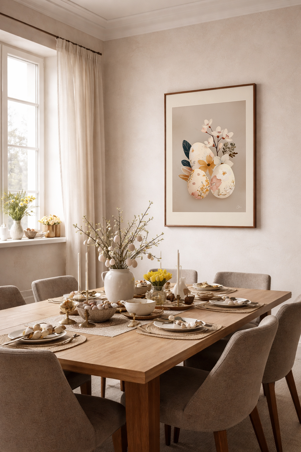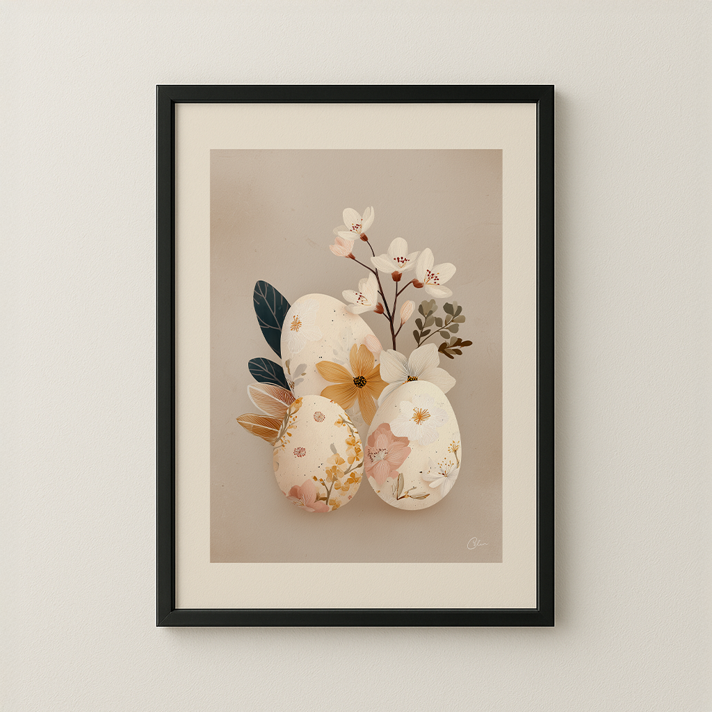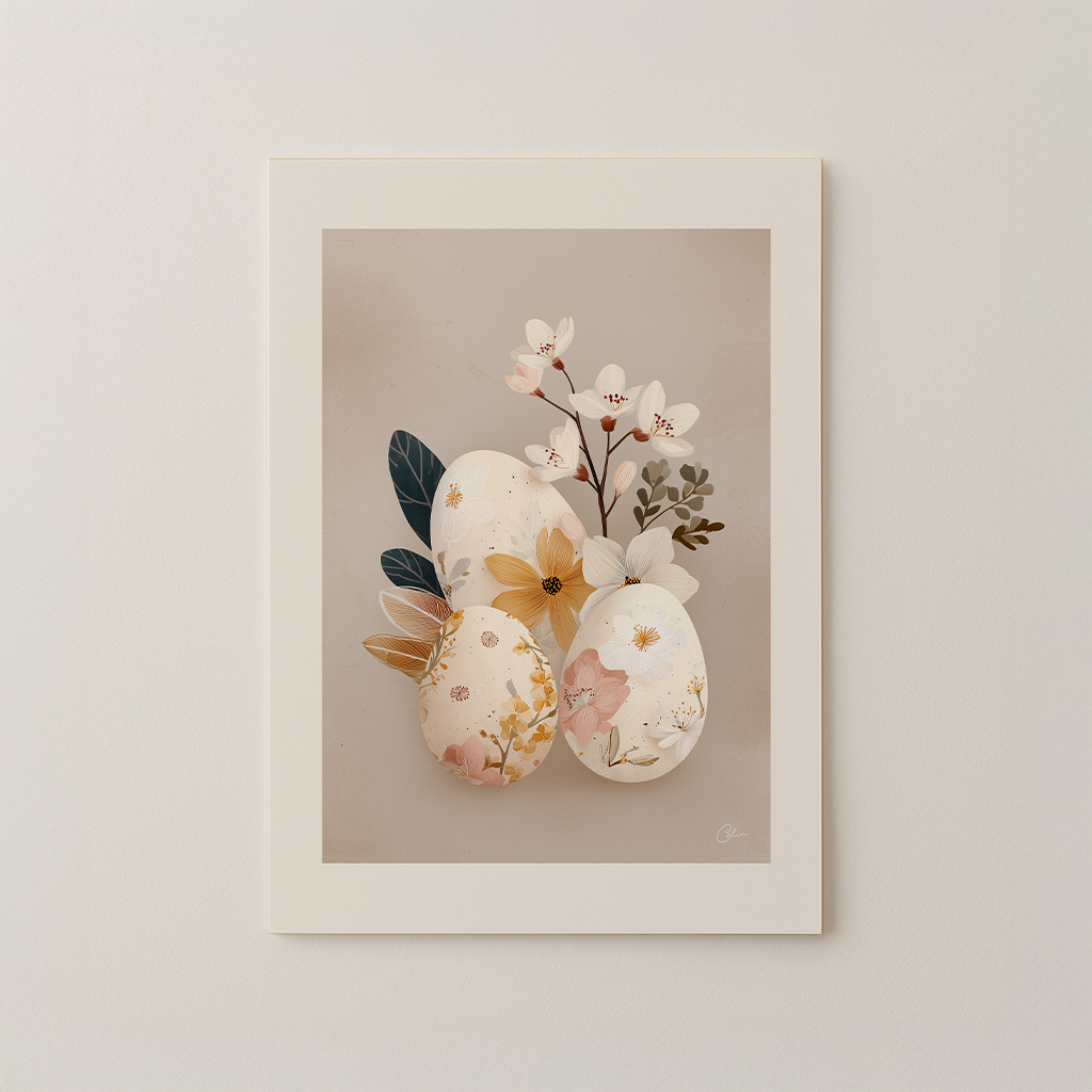 En mjuk botanisk påskkomposition med blommiga ägg i varma neutrala toner. Fina blommor, subtila texturer och en lugn beige bakgrund skapar ett fridfullt säsongsbetonat konstverk perfekt för vardagsrum, hallar och matsalar under våren.