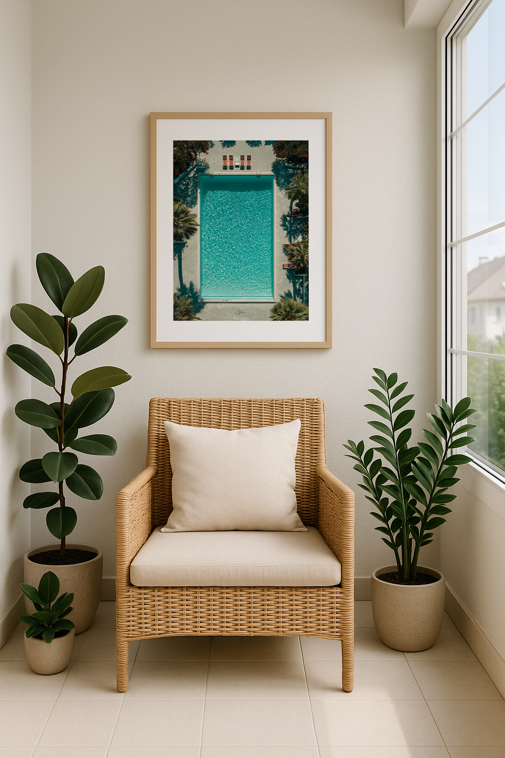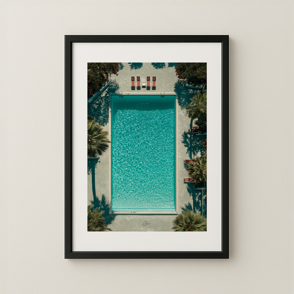 En perfekt antenn av stilla vatten, solblekta kakelplattor och palmskugga. Stilla geometri, full sommar.
