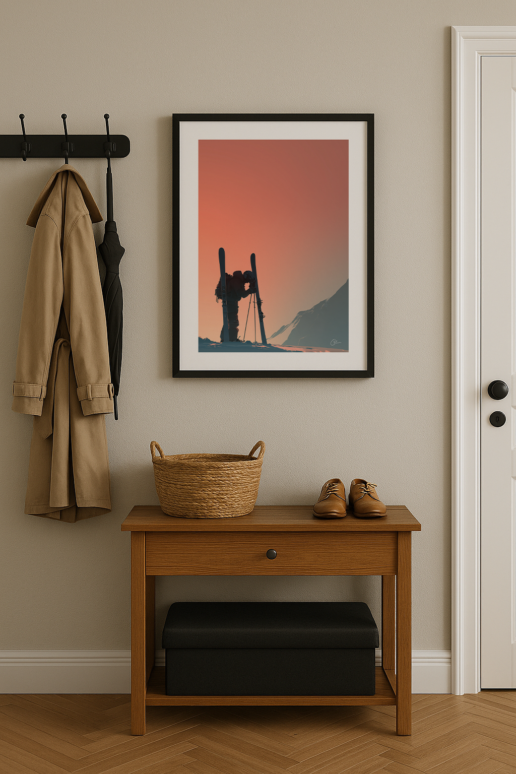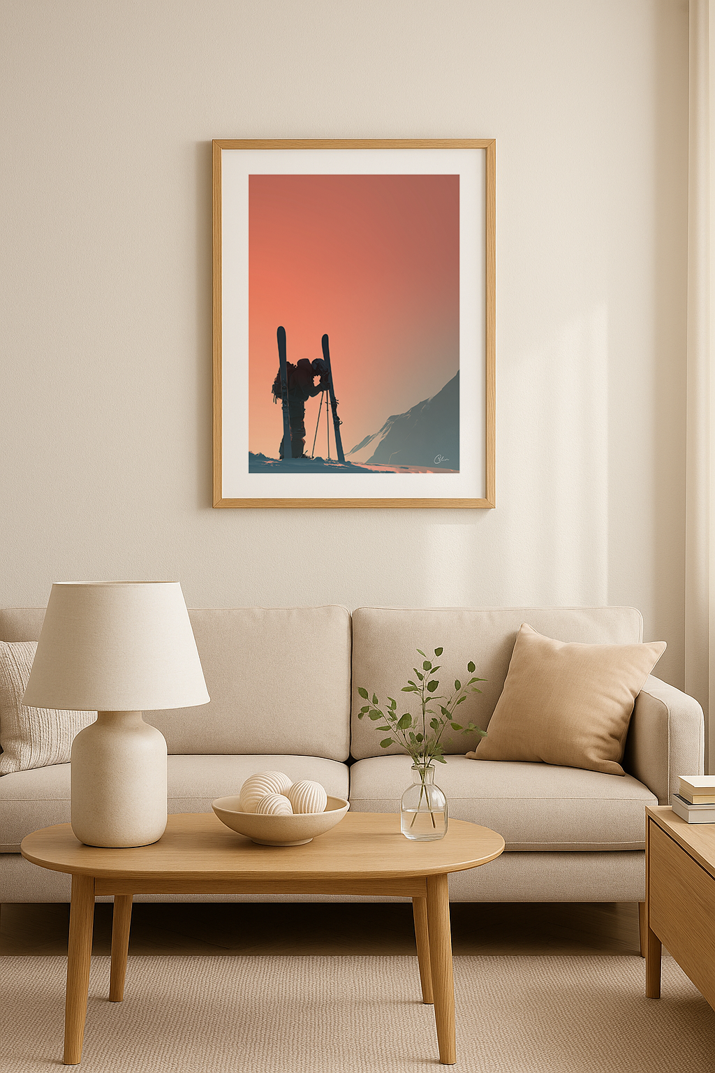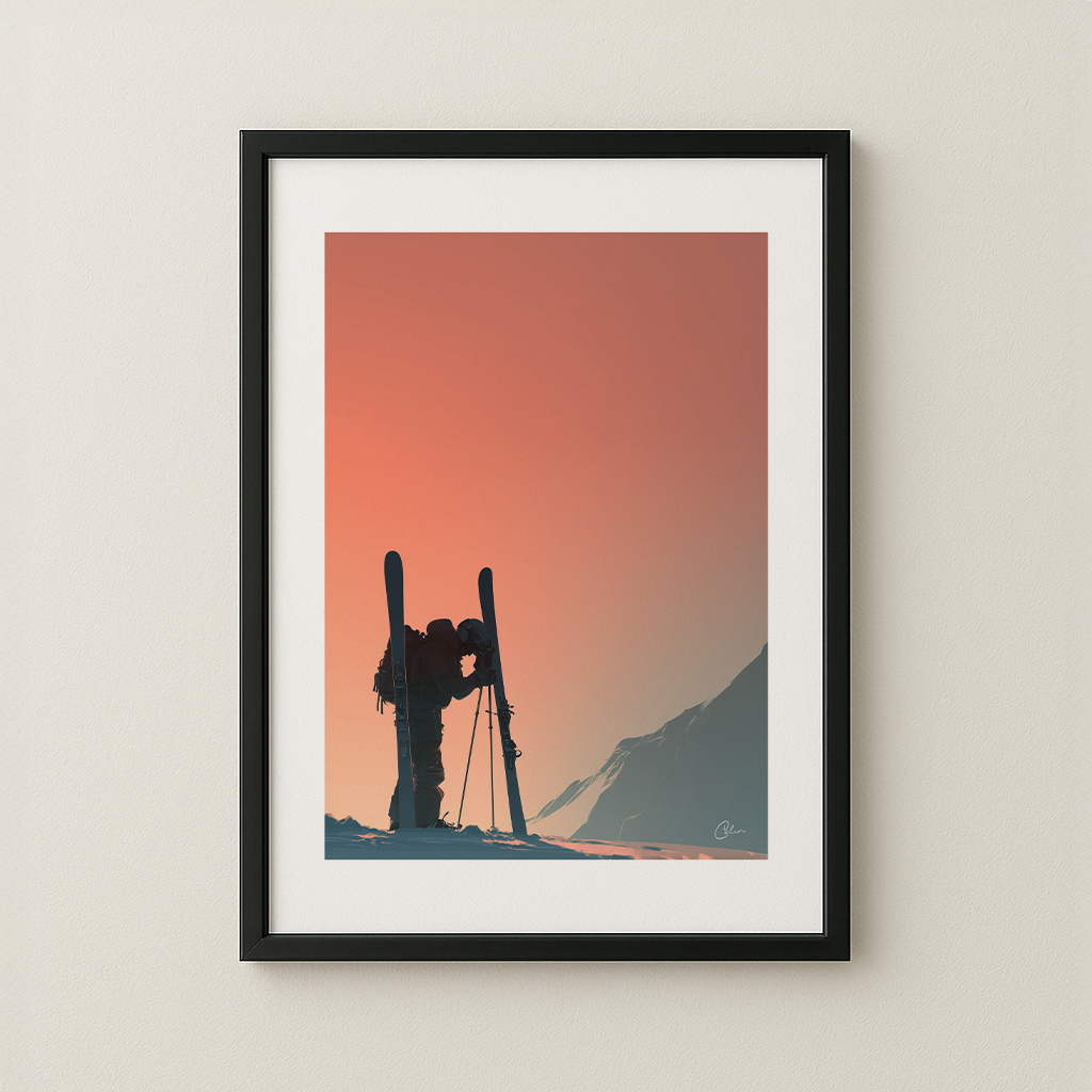 Ett fridfullt ögonblick fångat på toppen, där en skidåkare stannar upp mot det varma skenet från en soluppgång i bergen. Den mjuka, gradienta himlen kontrasterar vackert mot den skarpa silhuetten och frammanar balans, ensamhet och styrka. Perfekt för vardagsrum, hall eller hemmakontor.