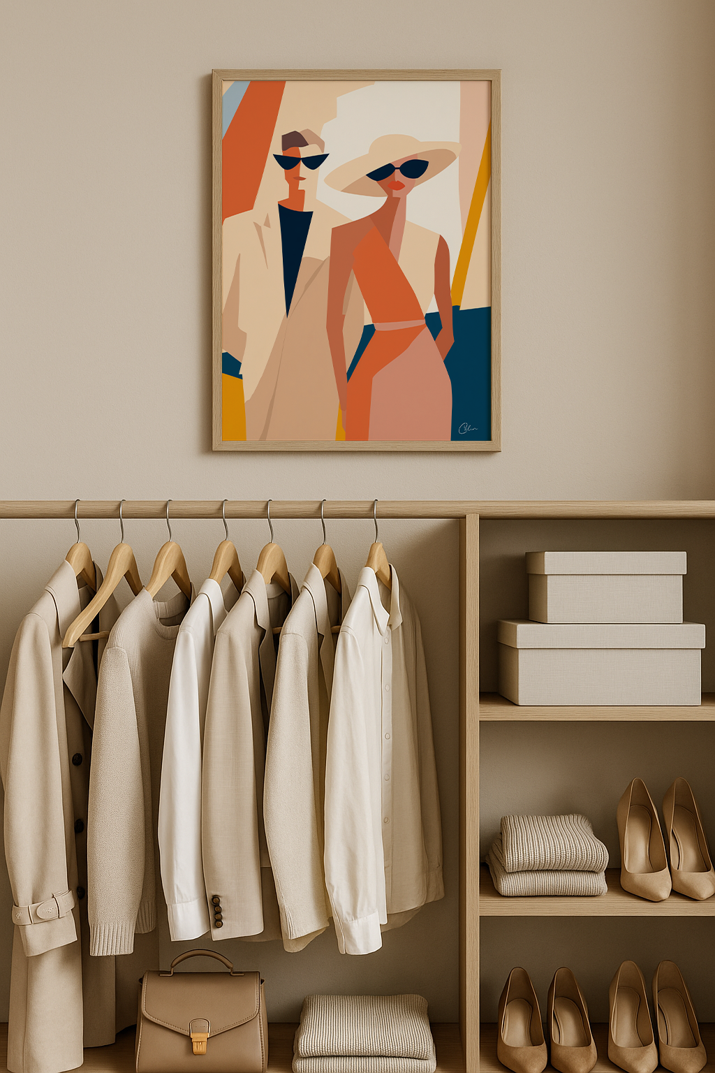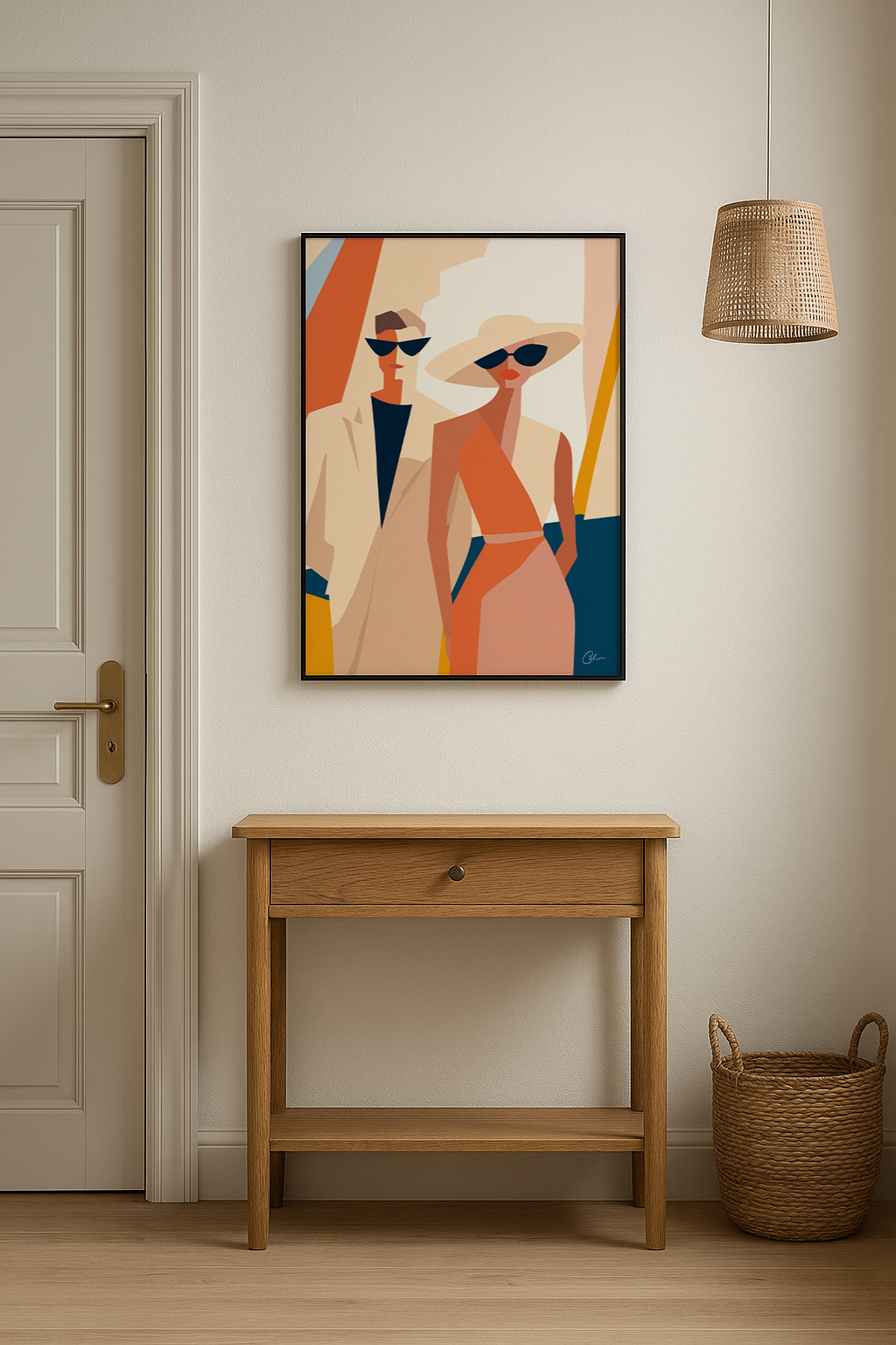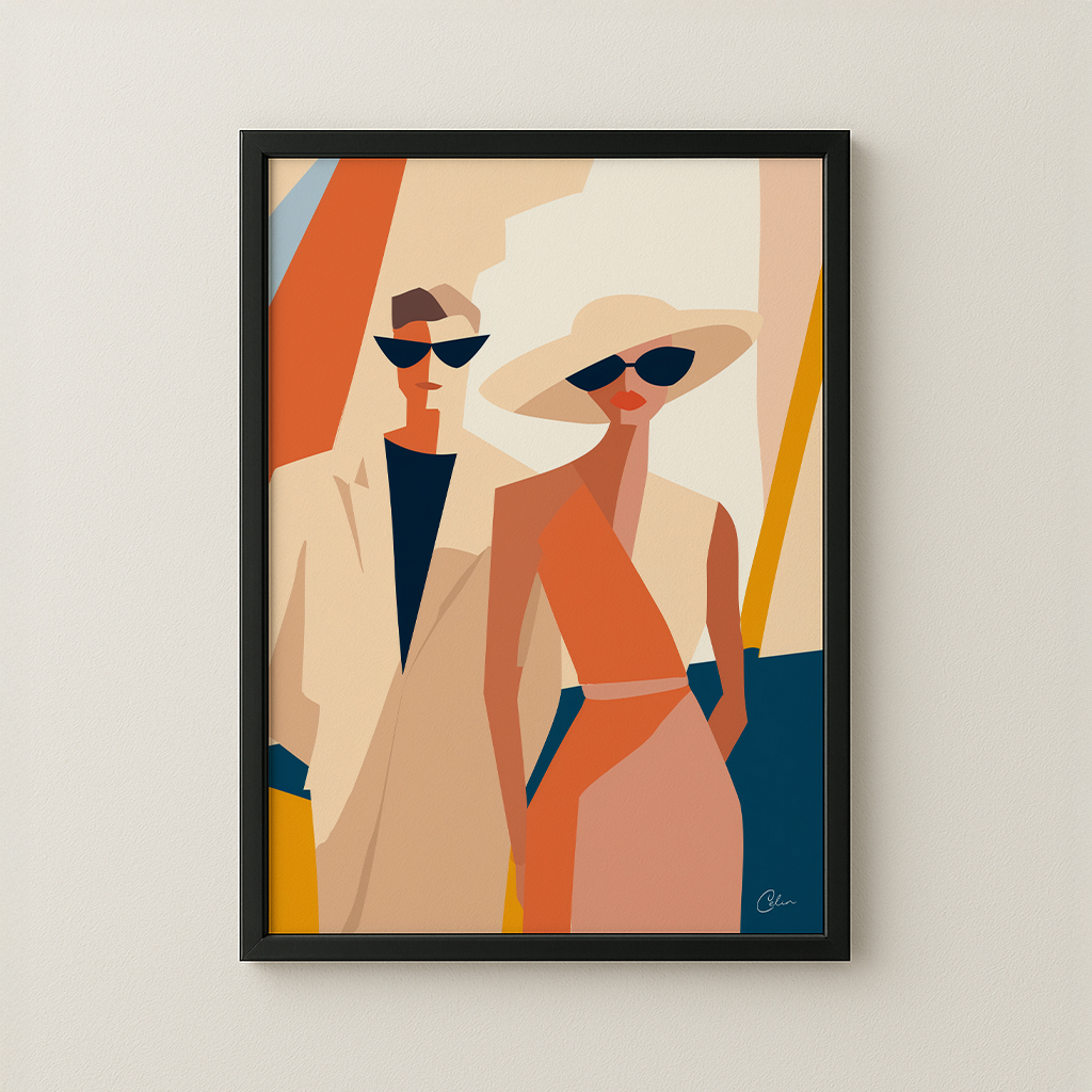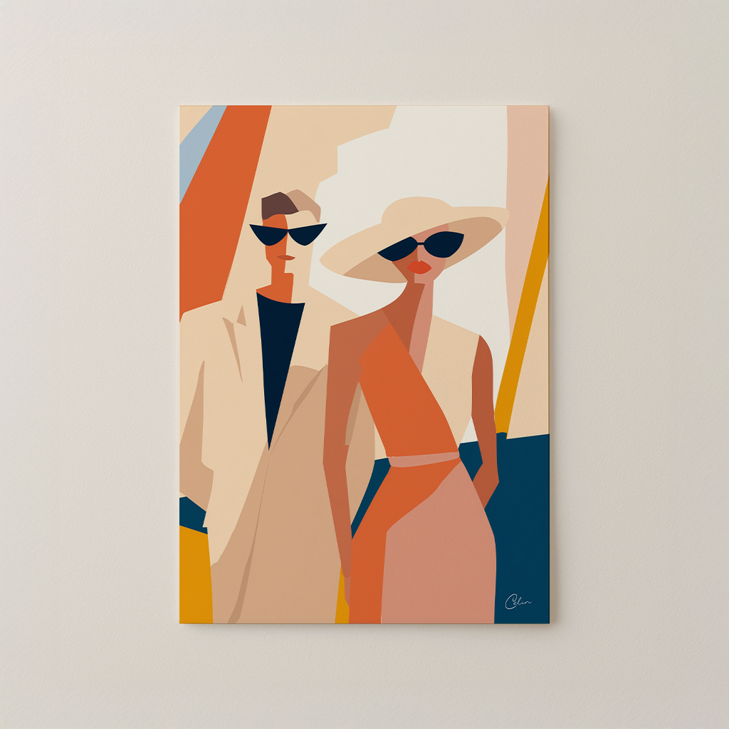 En djärv geometrisk illustration av ett moderiktigt par som utstrålar elegans och självförtroende i sommarsolen. Med sin varma palett av orange, beige och djupblå nyanser framkallar konstverket glamouren från medelhavskvällar och societetssammankomster. Perfekt för vardagsrum , matsal eller walk-in-closet , och den förstärker interiörer som föredrar modern design, retroinfluenser och livfulla accenter.