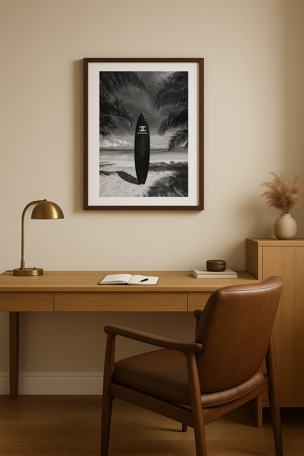 Surf Society förenar högmode med kustnära frihet. En svart Chanel-surfbräda står ensam mellan palmskuggor och havsvågor – en symbol för diskret lyx och modern eskapism. Perfekt för vardagsrum, hall eller hemmakontor, särskilt i monokroma eller minimalistiska färgmiljöer.