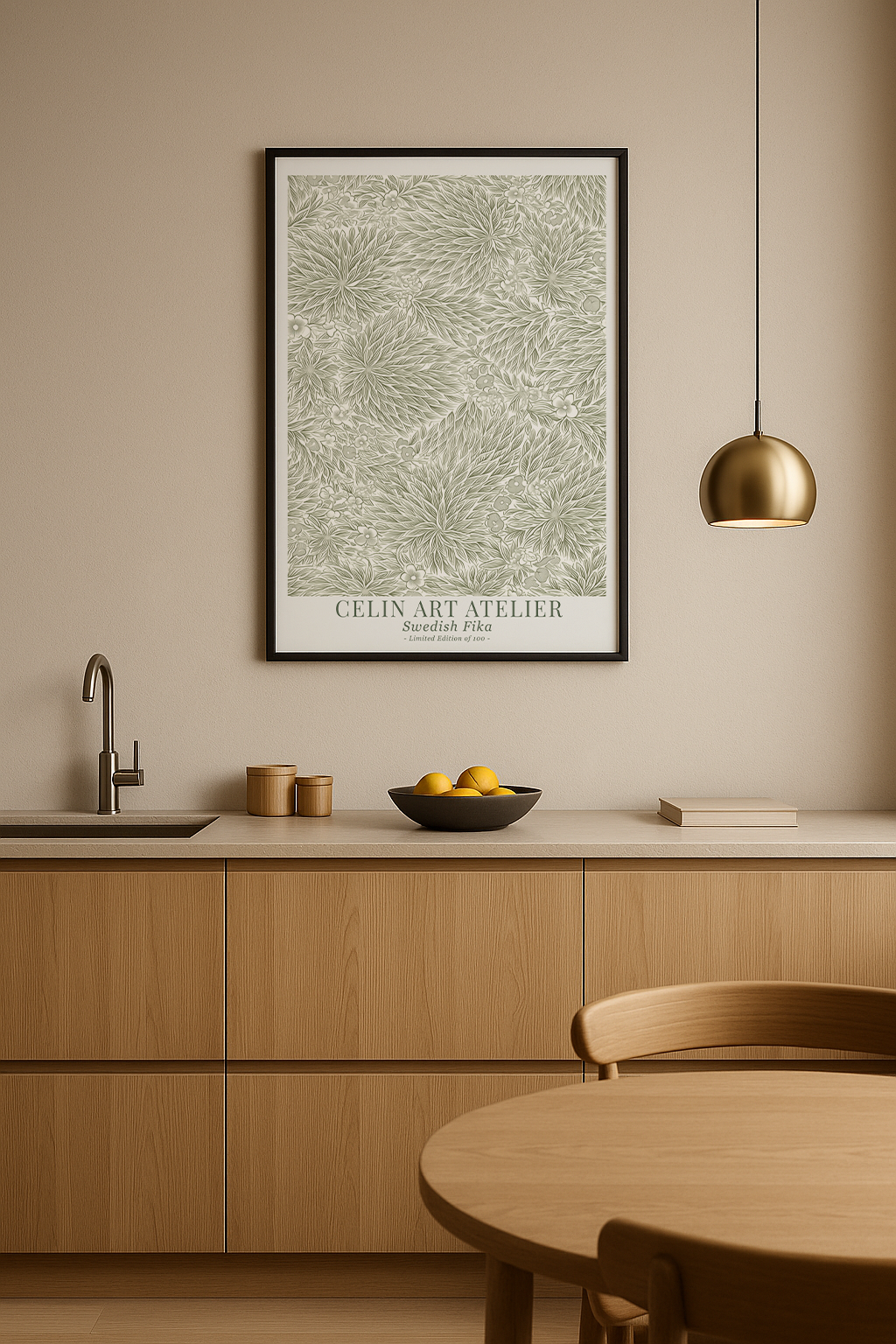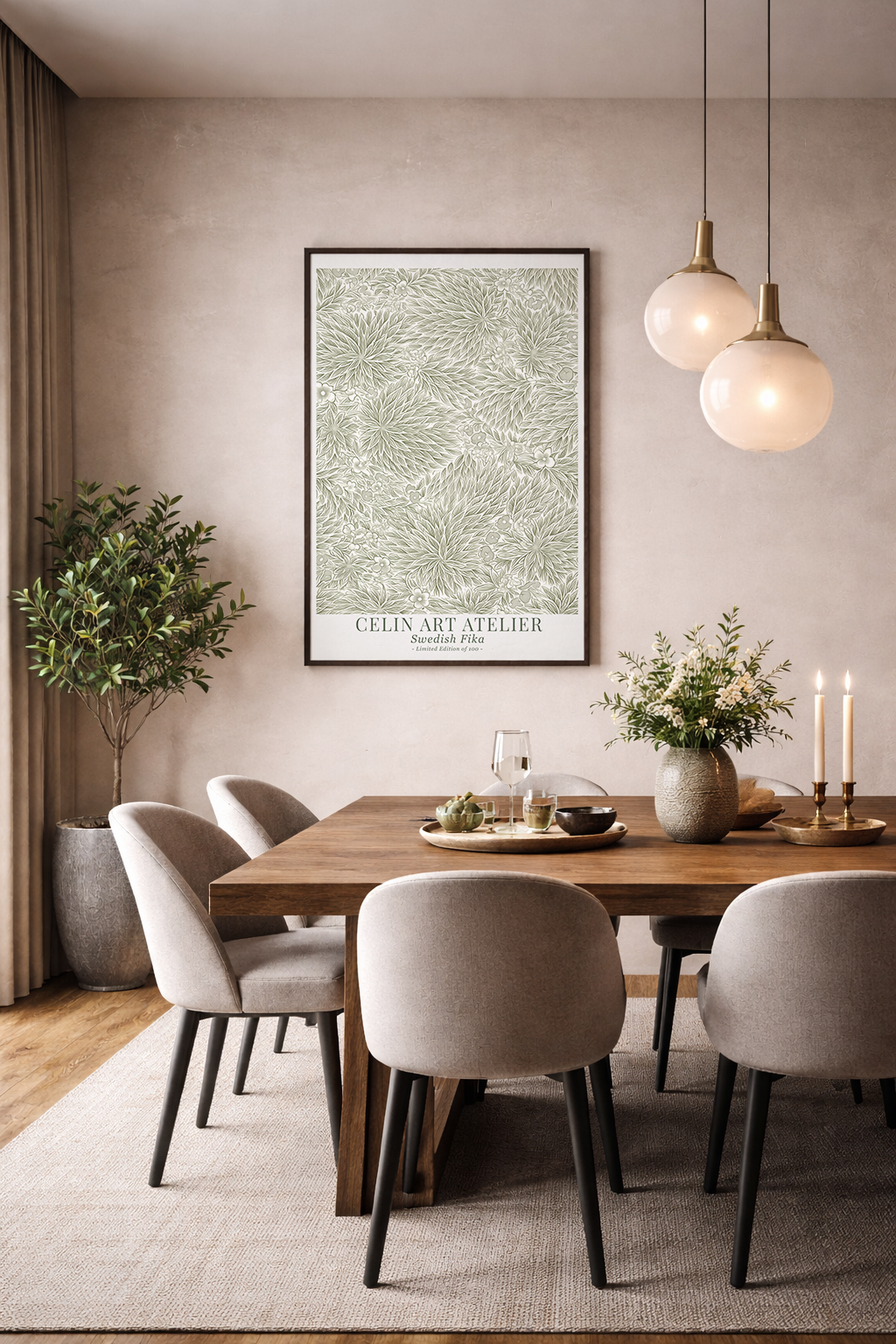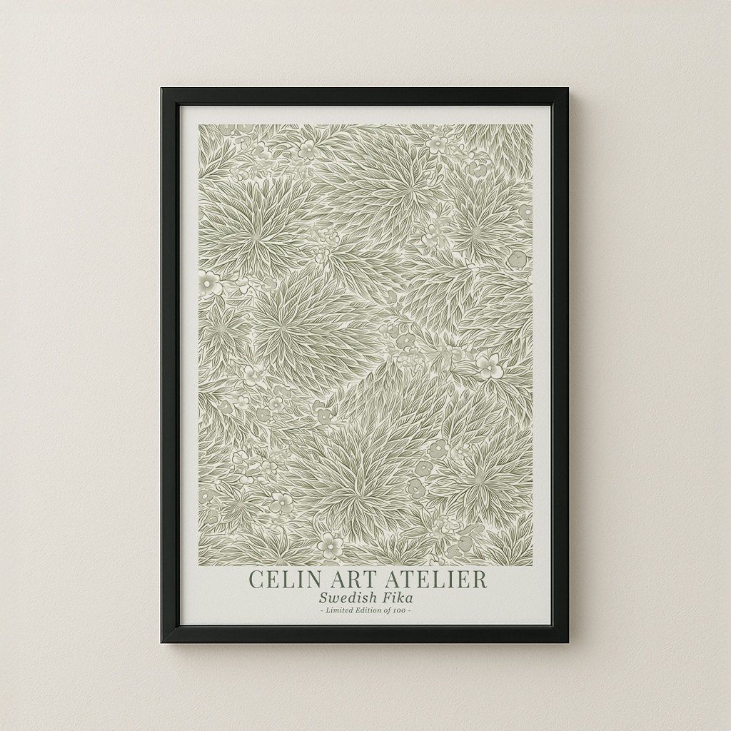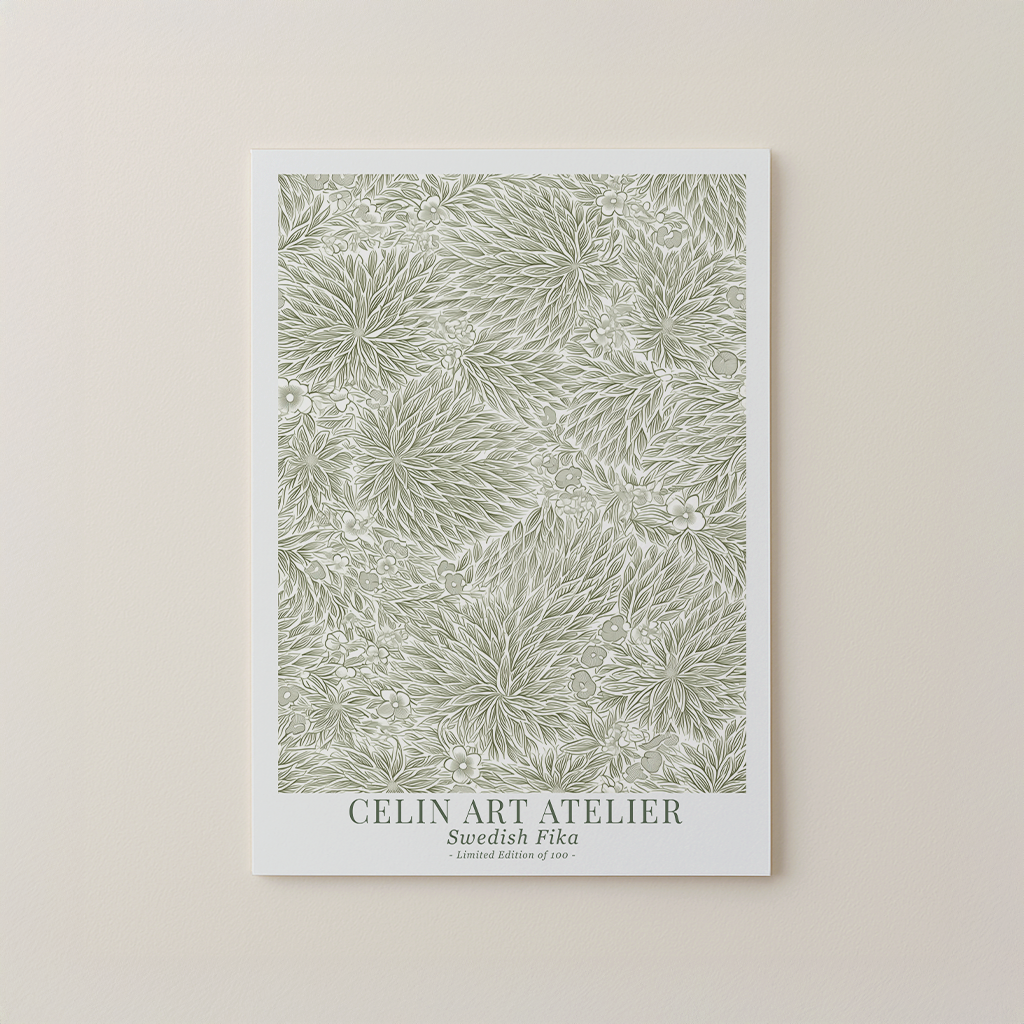 De delikata botaniska linjerna och den mjukt gröna paletten skapar en lugn, elegant komposition som passar vackert ihop med en digital passepartout i benvitt, vilket ger mönstret utrymme att andas samtidigt som det bevarar sin förfinade nordiska karaktär.