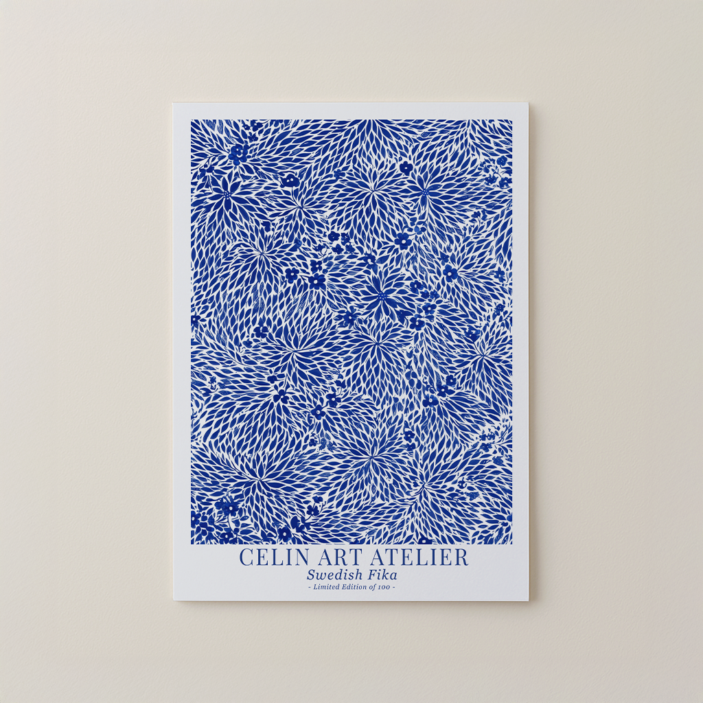 Det intrikata botaniska mönstret, där böljande blommönster skapar rytm och elegans i kompositionen. Den blå paletten förstärker den historiska kopplingen till nordisk porslinsdesign, vilket gör att konstverket känns både tidlöst och distinkt skandinaviskt.