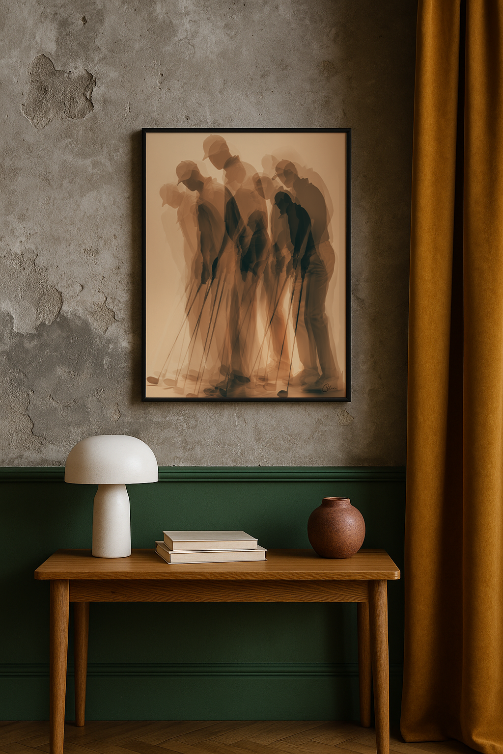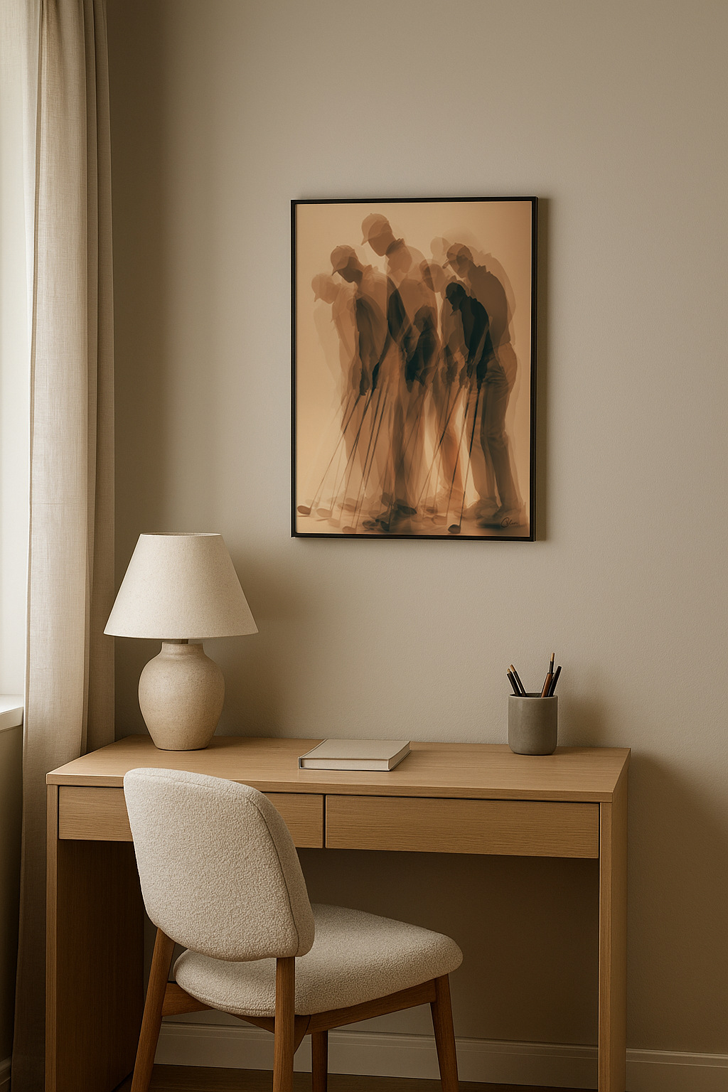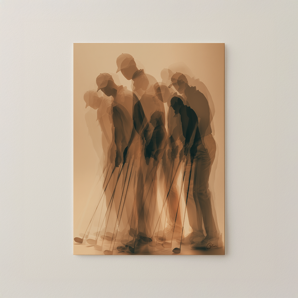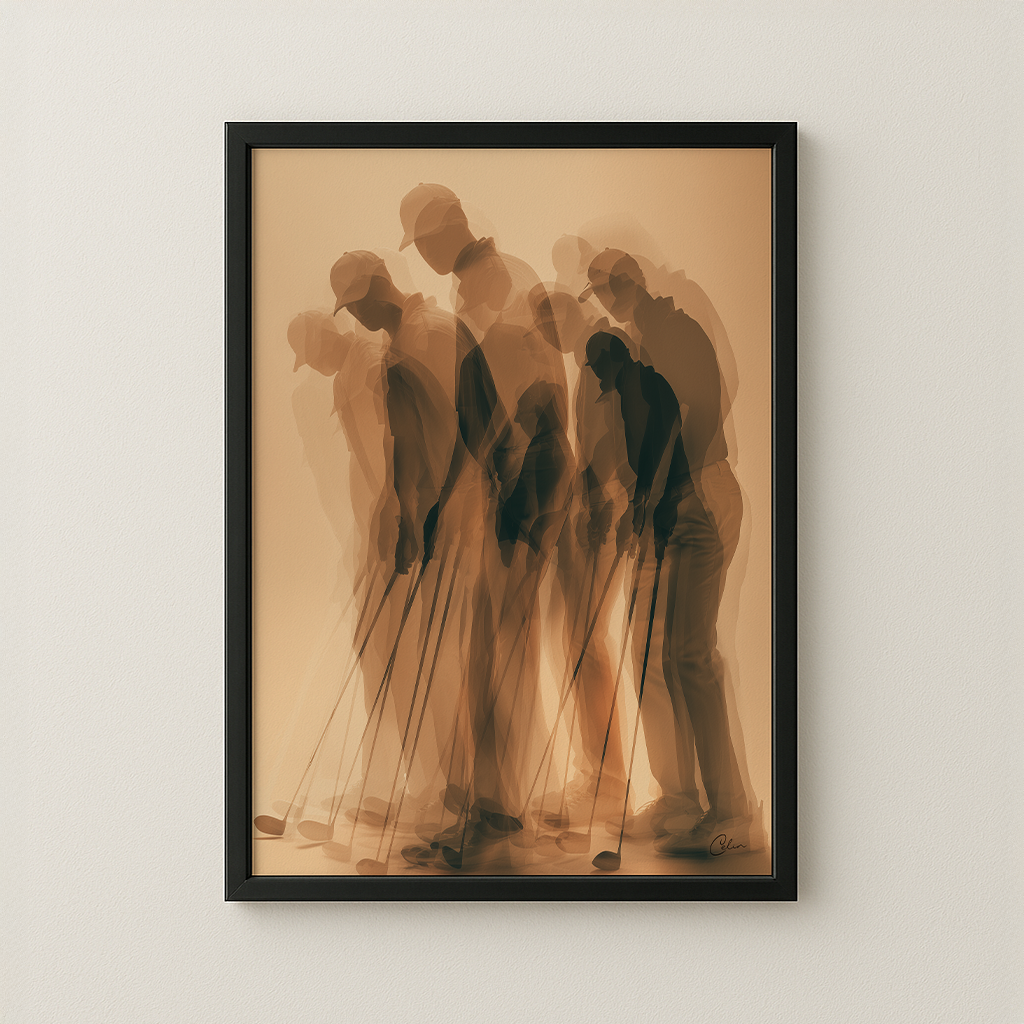 En skiktad studie av rörelse och form, som fångar rytmen i en golfares sving genom flera transparenta silhuetter. De varma gradienttonerna förstärker känslan av fokus, repetition och balans, och förvandlar ett sportögonblick till ett kinetisk konstverk. Perfekt för ett kontor, en hall eller ett vardagsrum där rörelse och precision möter lugn elegans.