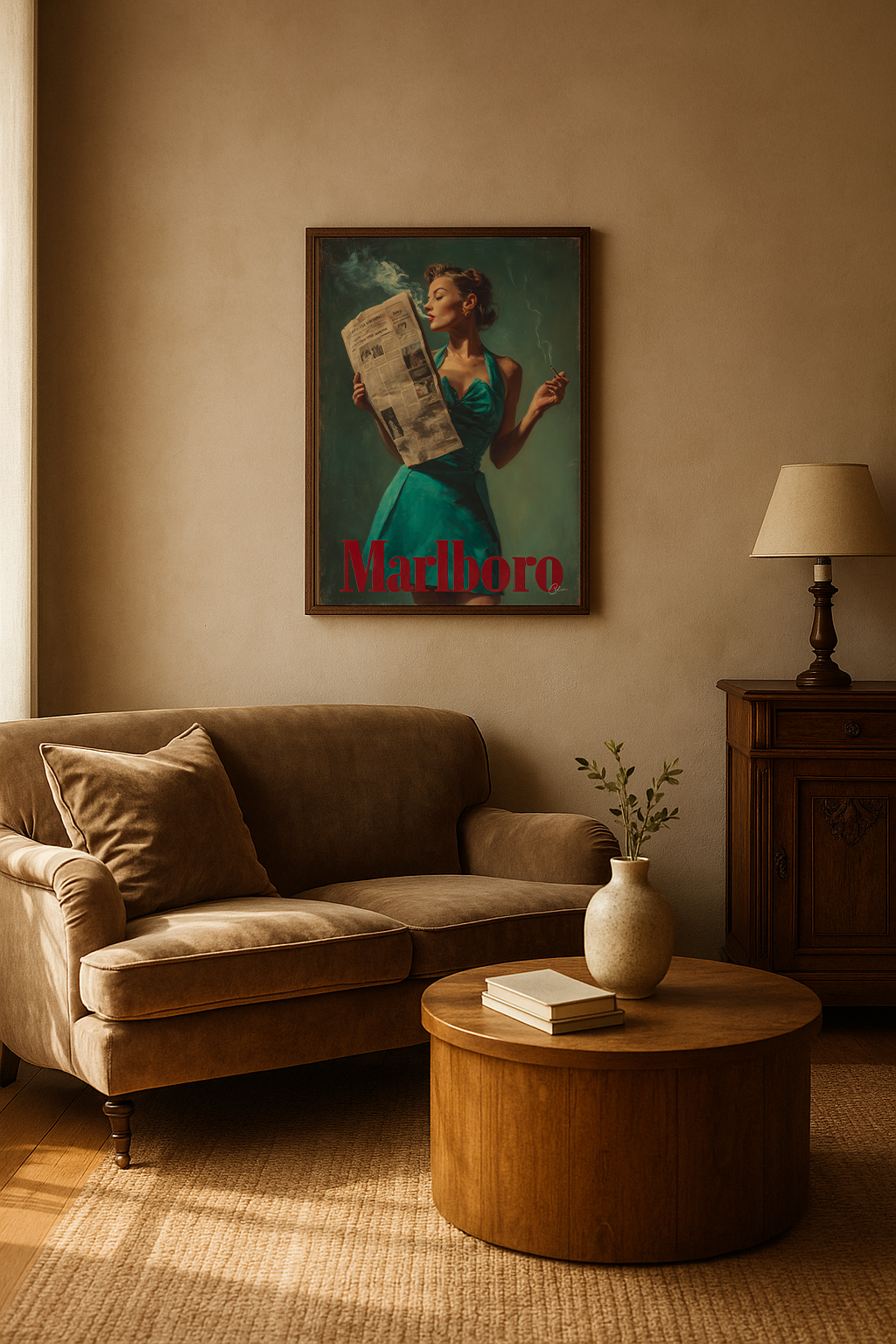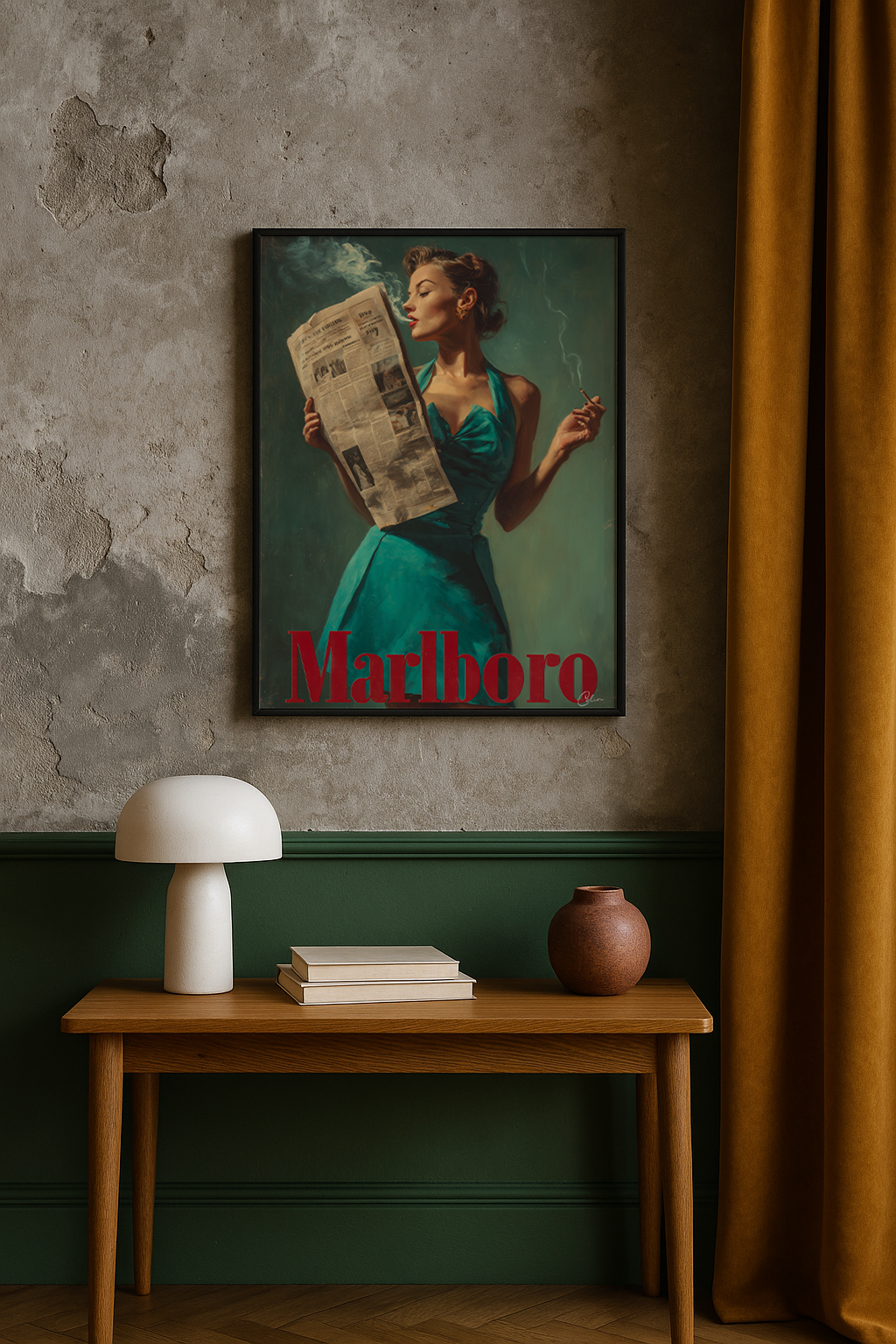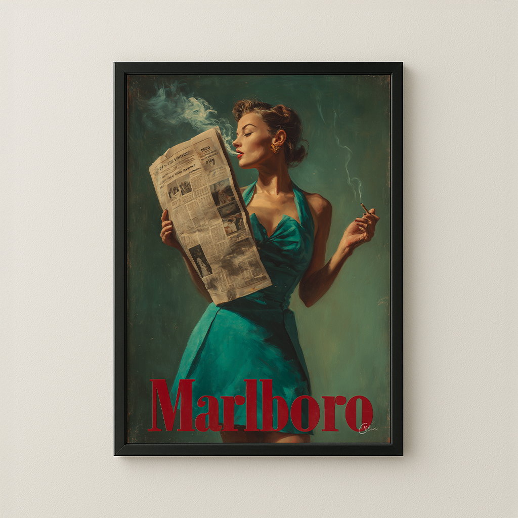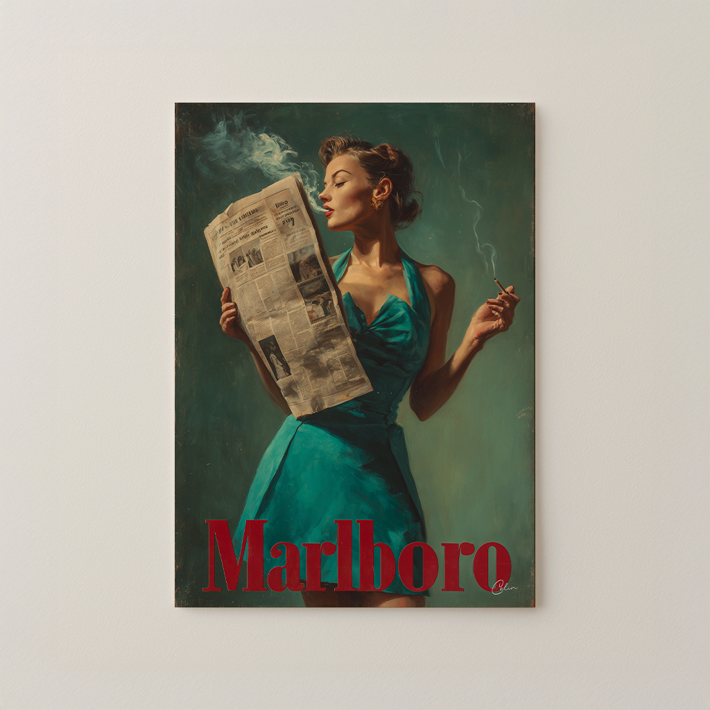 Ett djärvt retroinspirerat konstverk som porträtterar en glamorös kvinna i en blågrön klänning med en cigarett i handen och läser morgontidningen. Den djupt gröna bakgrunden och de måleriska texturerna framhäver den röda "Marlboro"-typografin, vilket ger verket en nostalgisk reklamestetik. Perfekt för vardagsrum , hemmakontor eller hall , passar det bra ihop med interiörer som omfamnar vintagestil, djärva färger eller eklektiska designelement.