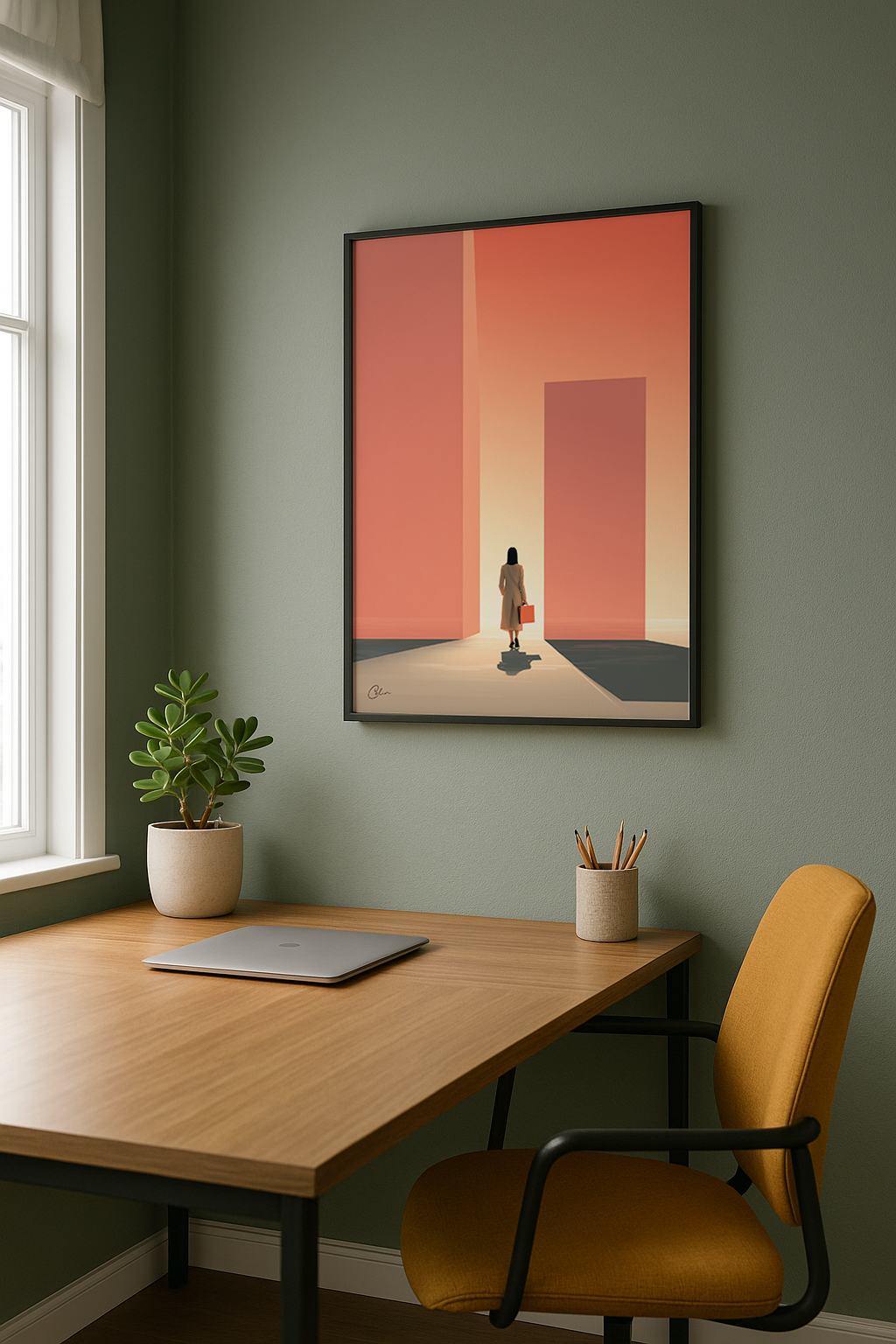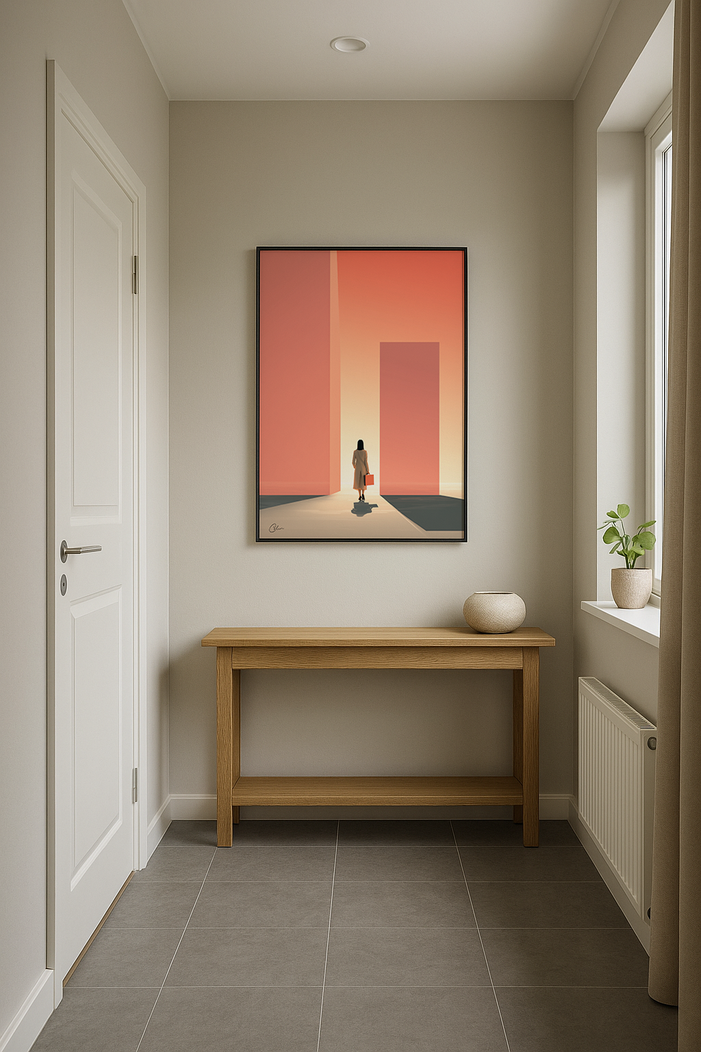 Perfekt för hallen, hemmakontoret eller sovrummet. Den mjuka paletten och den djärva symboliken gör den till en slående accent i både minimalistiska och varma interiörer.