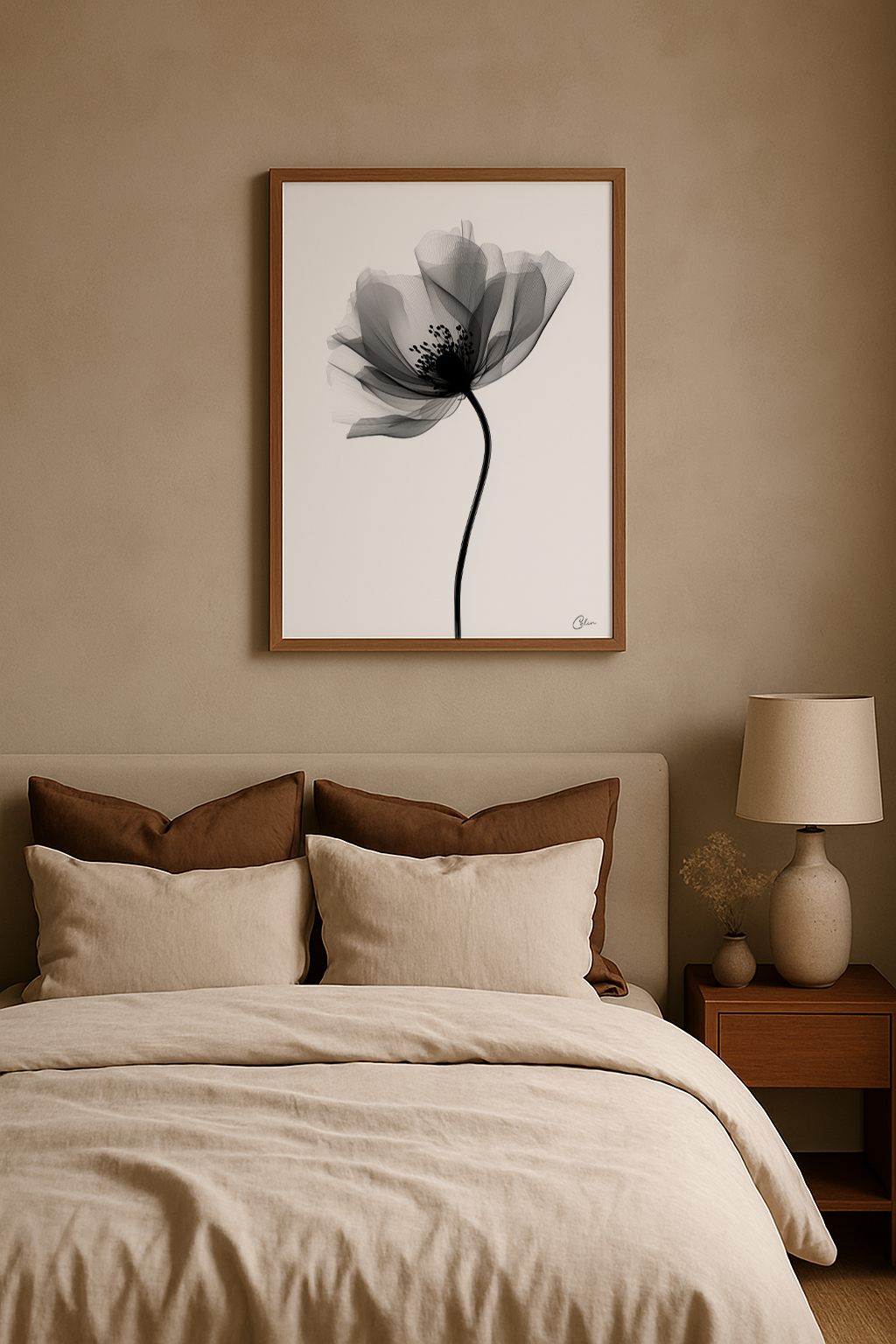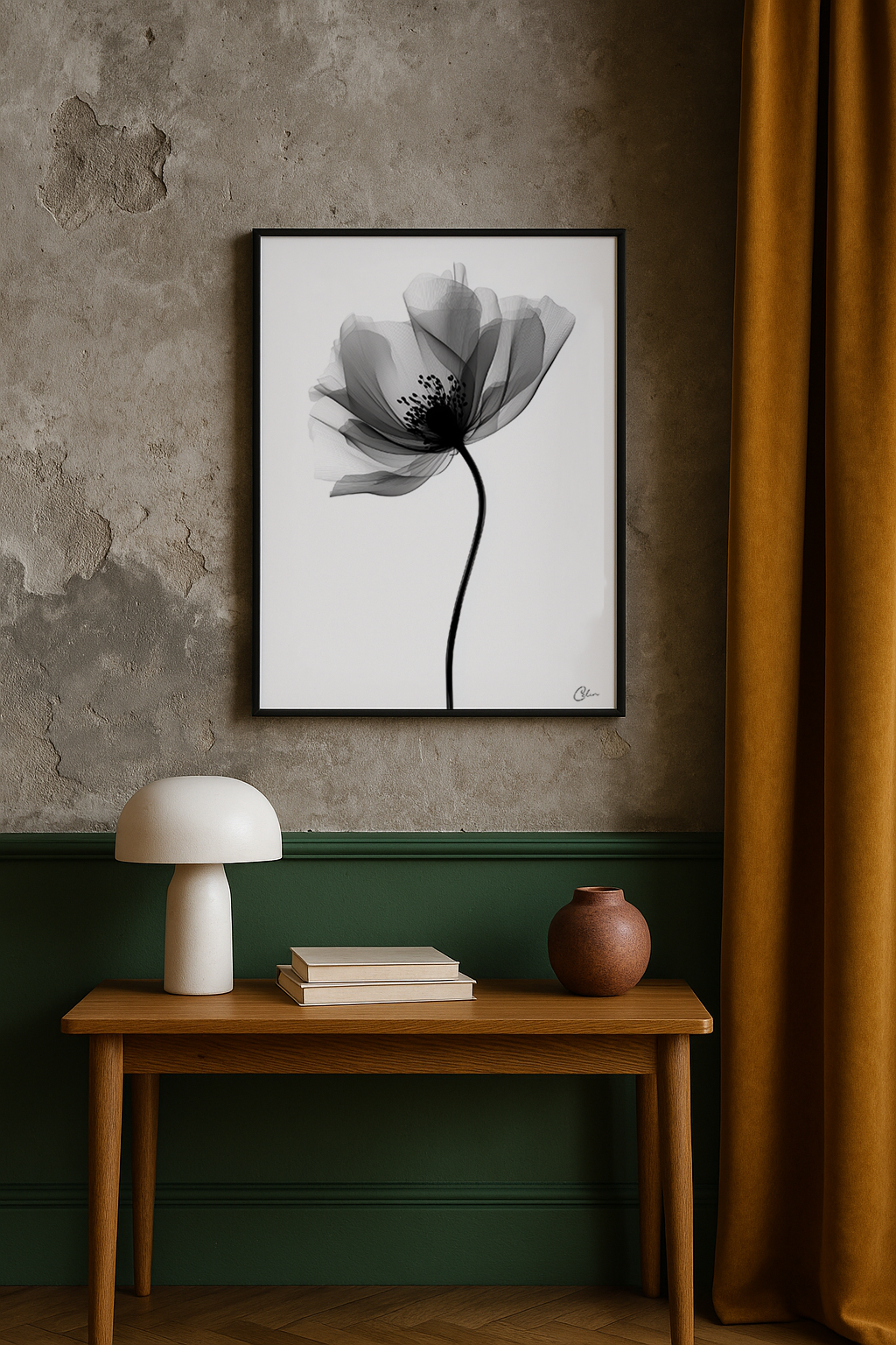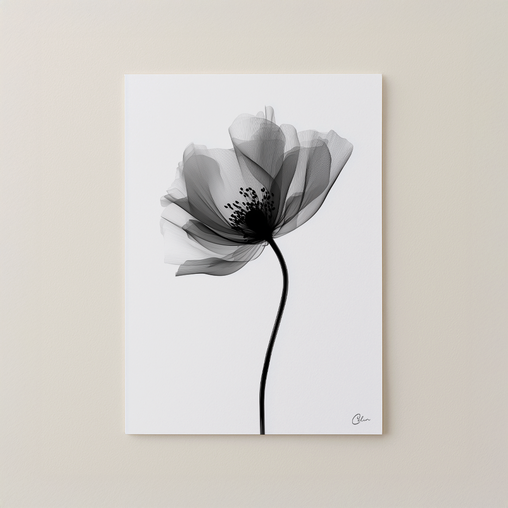 Ett delikat monokromt konstverk som porträtterar en blomma i mjuk röntgenstil, där genomskinliga kronblad överlappar varandra för att avslöja graciösa detaljer och dolda strukturer. Den minimalistiska svartvita estetiken skapar en lugn och sofistikerad stämning, perfekt för interiörer som omfamnar elegans och enkelhet. Perfekt för sovrum , vardagsrum eller hall , och den passar vackert ihop med skandinavisk design, modern minimalism och neutrala färgpaletter.