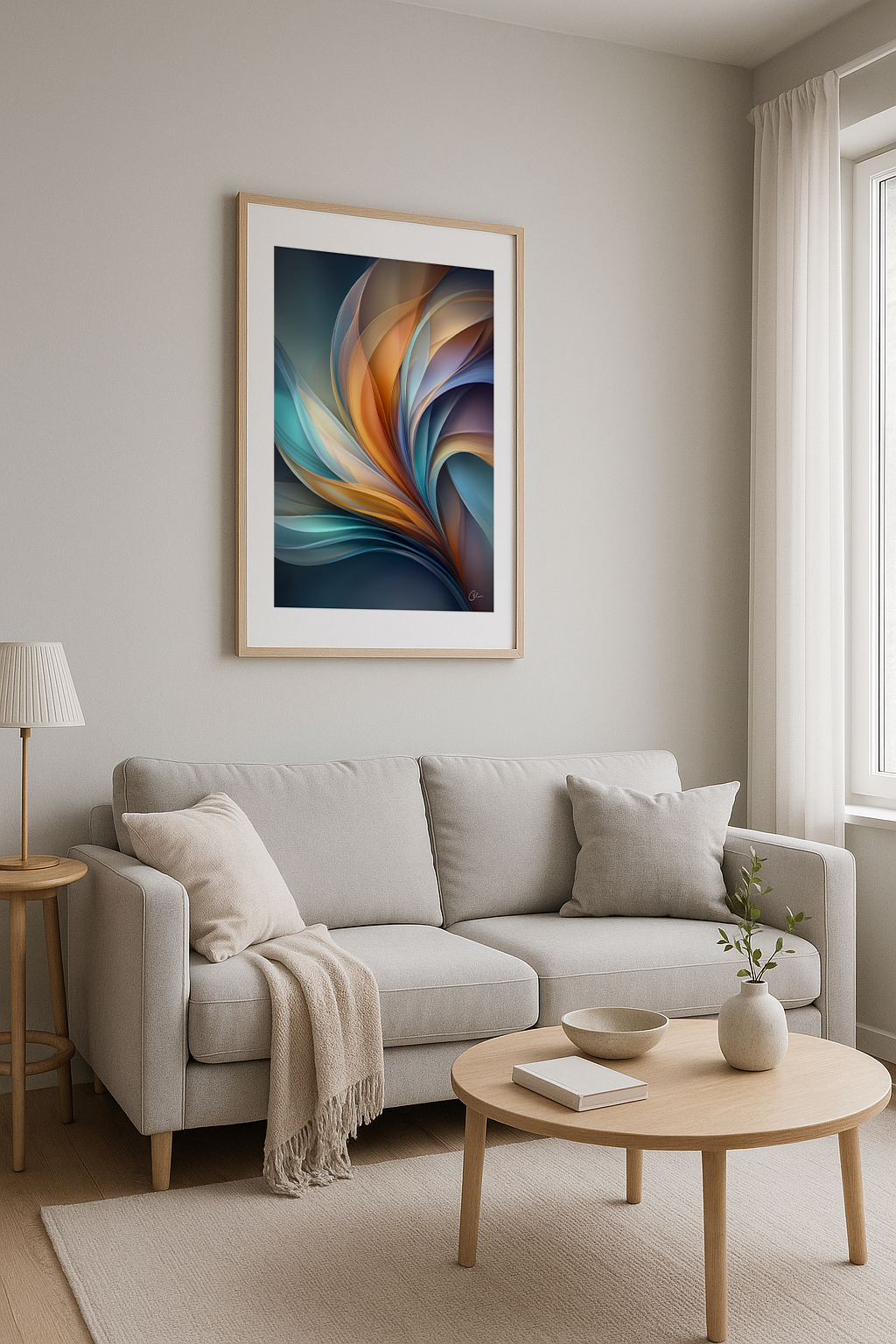 Böjda, genomskinliga former i bränt orange, havsblå och mjuk lavendel flyter uppåt som vingar mitt i rörelsen. Ett dynamiskt möbel för vardagsrum, hallar eller kreativa arbetsytor, särskilt där varma neutrala färger möter kallare toner som marinblått, turkos eller malva.